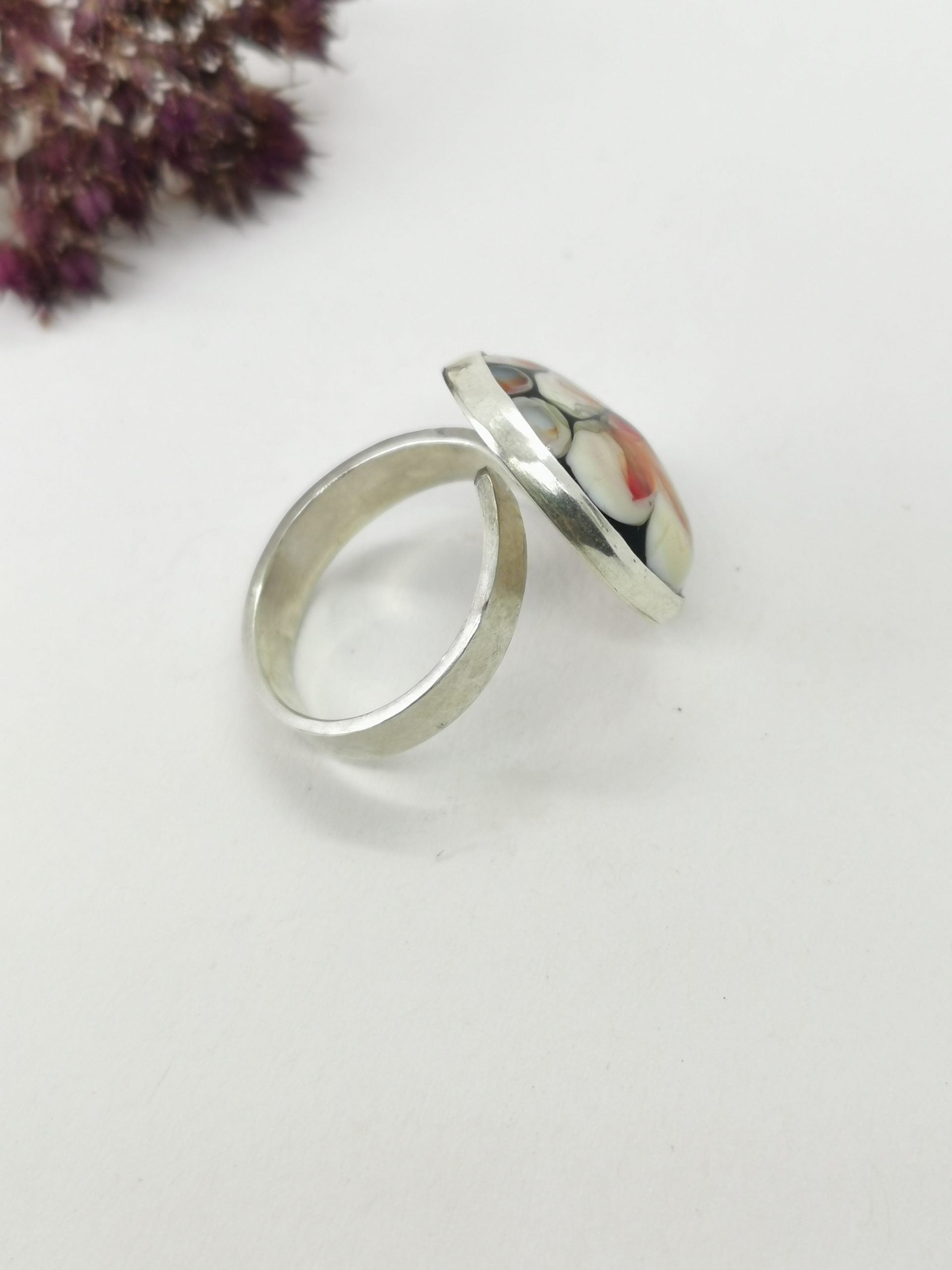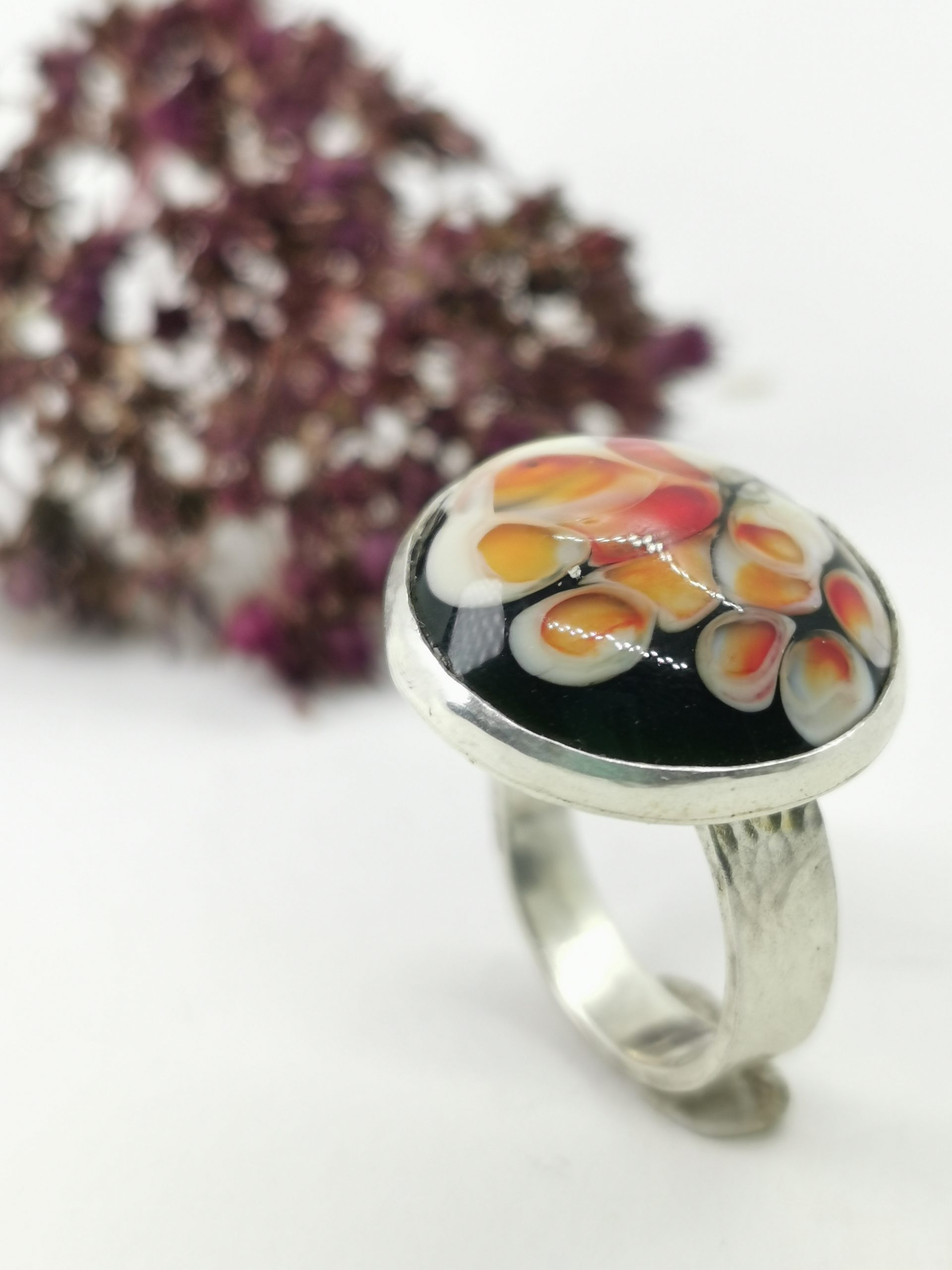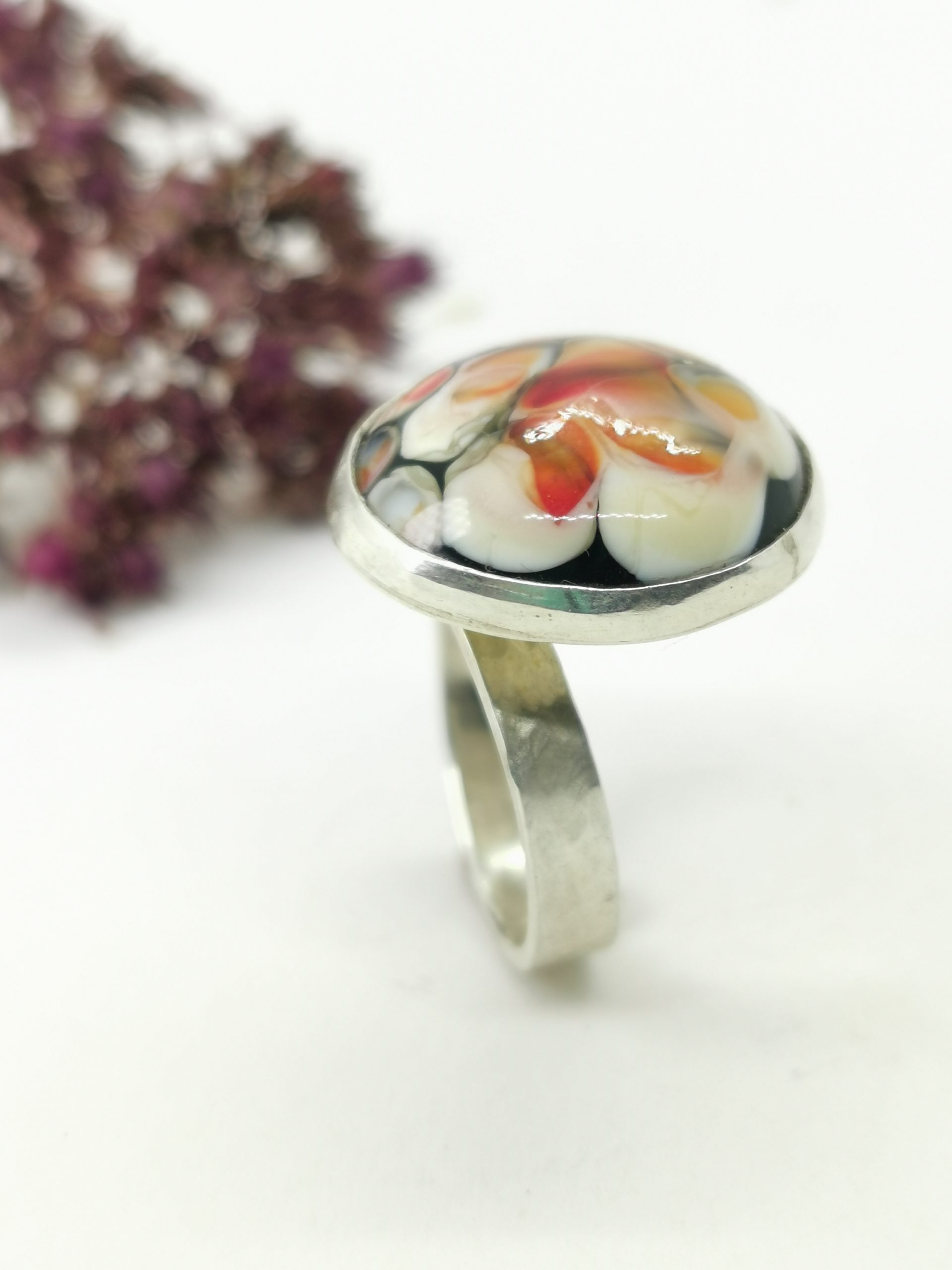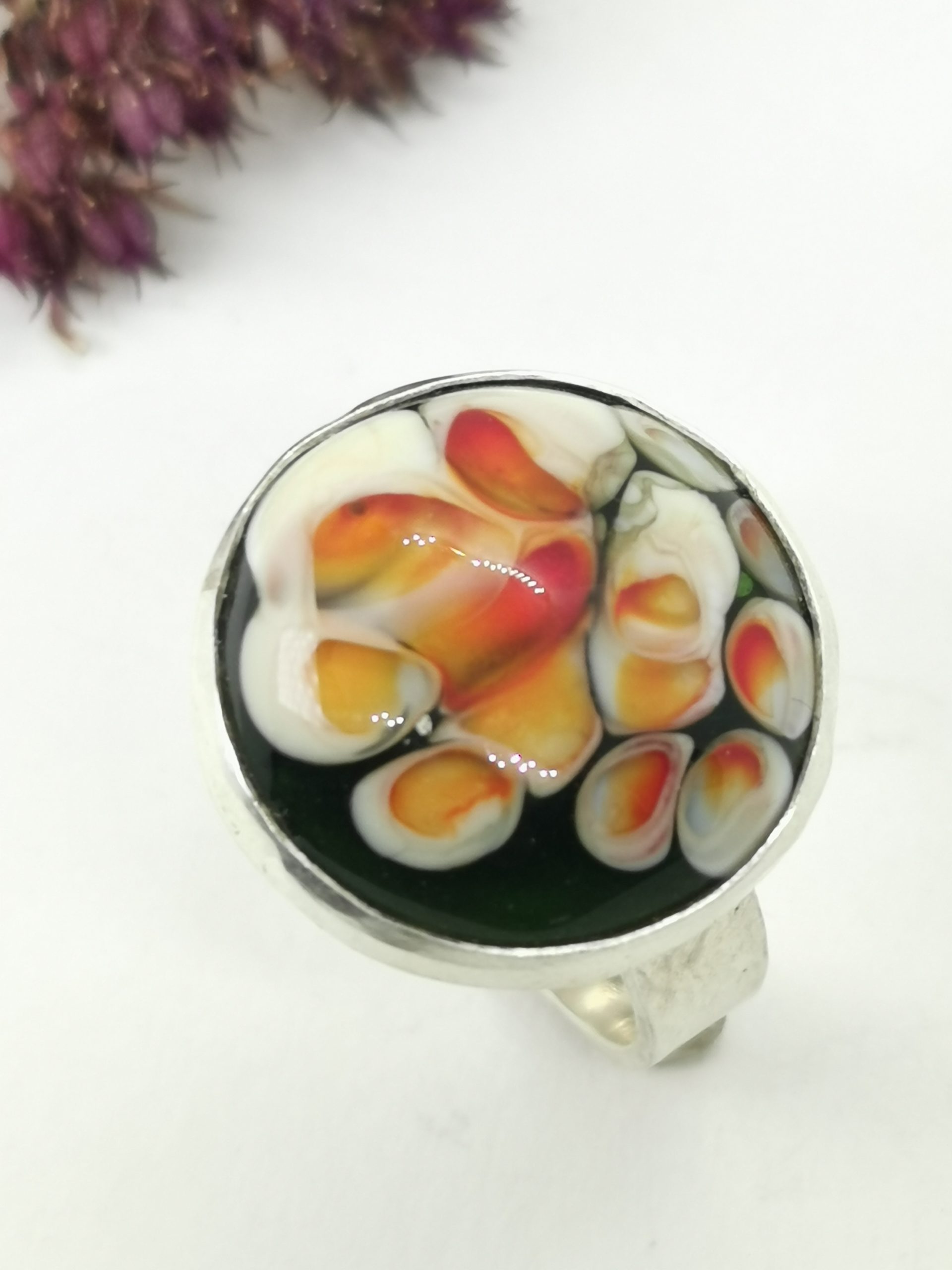 Bague cabochon en verre fabriqué au chalumeau. Diamètre environ 20 mm.