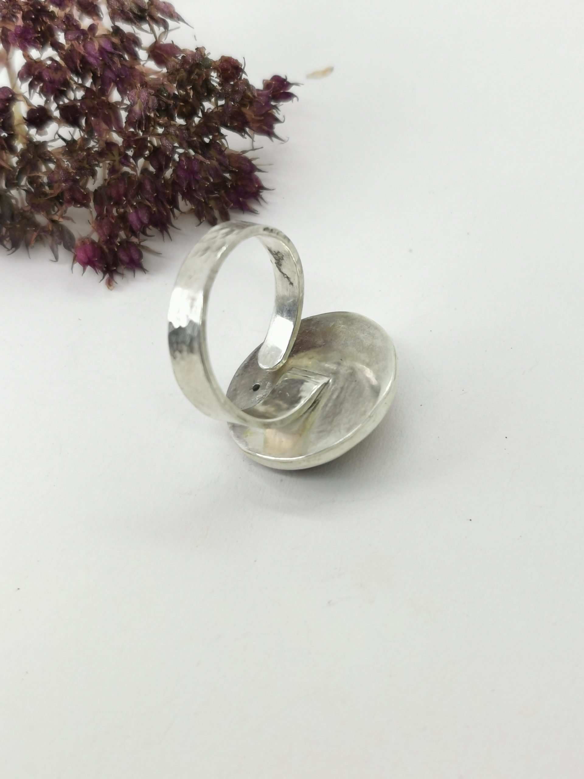 Serti argent, corps de bague ajustable en argent massif. Le tout fabriqué dans mon atelier.