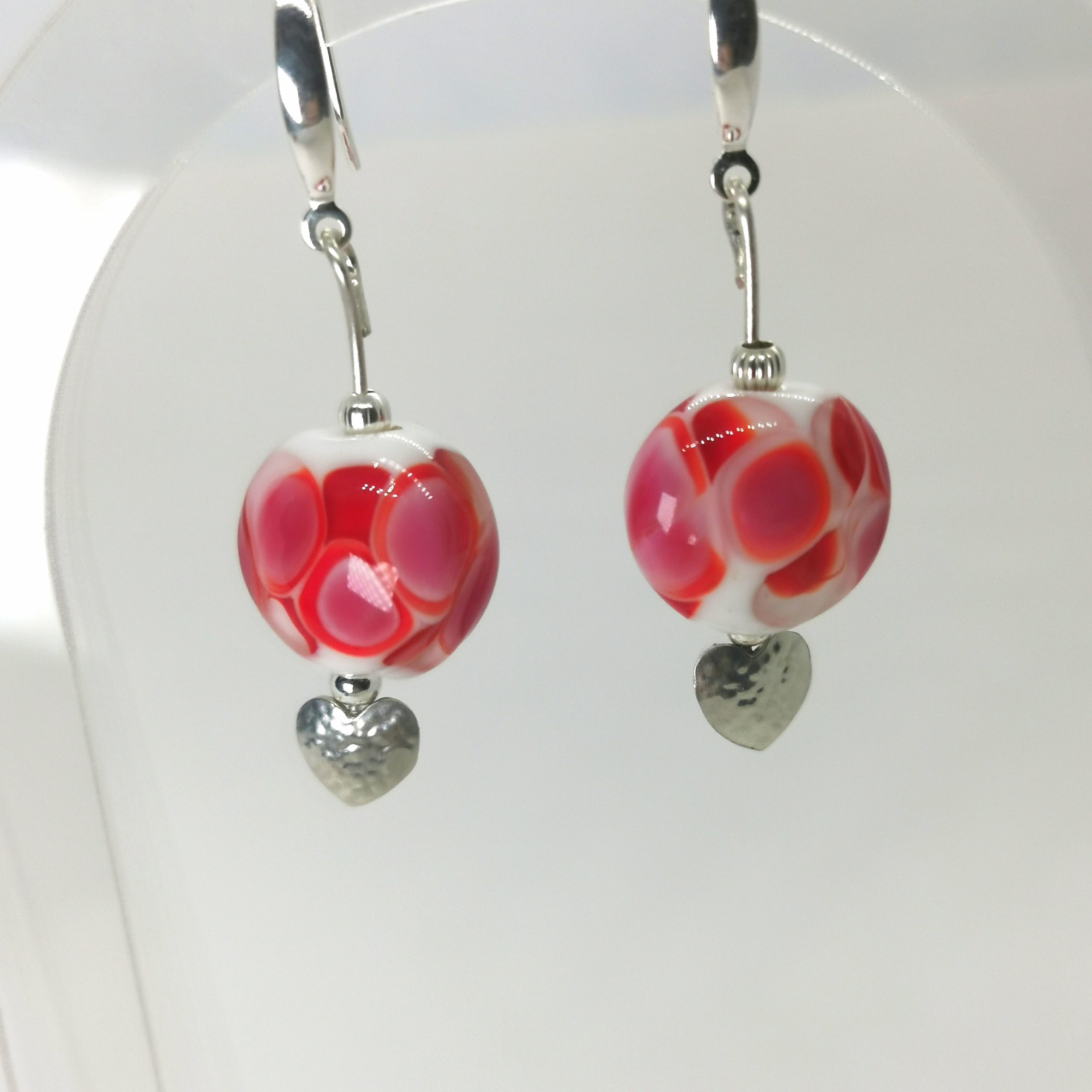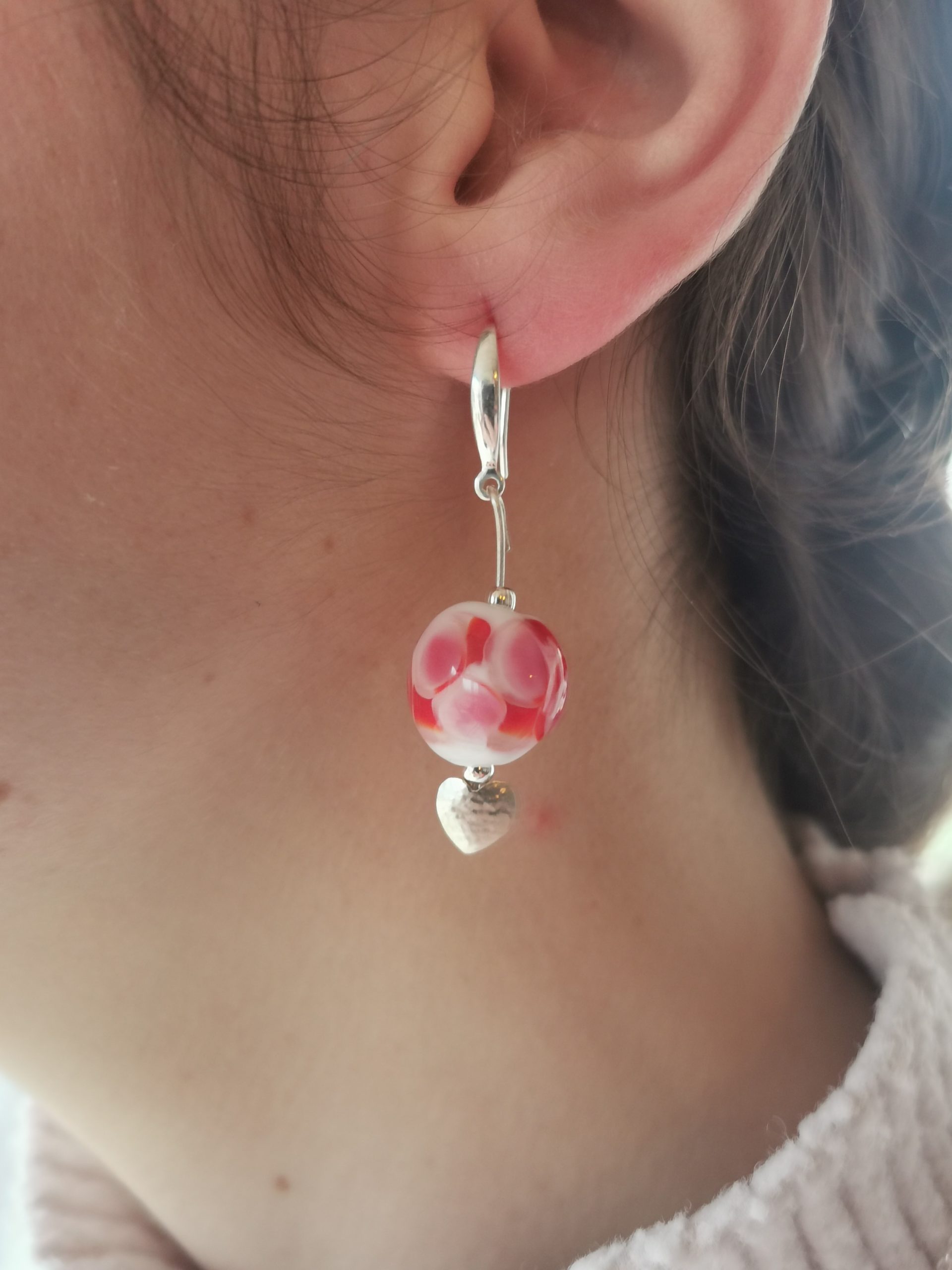 Ces magnifiques boucles d’oreilles, très élégantes avec l’éclat de l’argent des petits cœurs martelés, les différentes nuances du verre transparent donneront une belle allure à vos tenues.