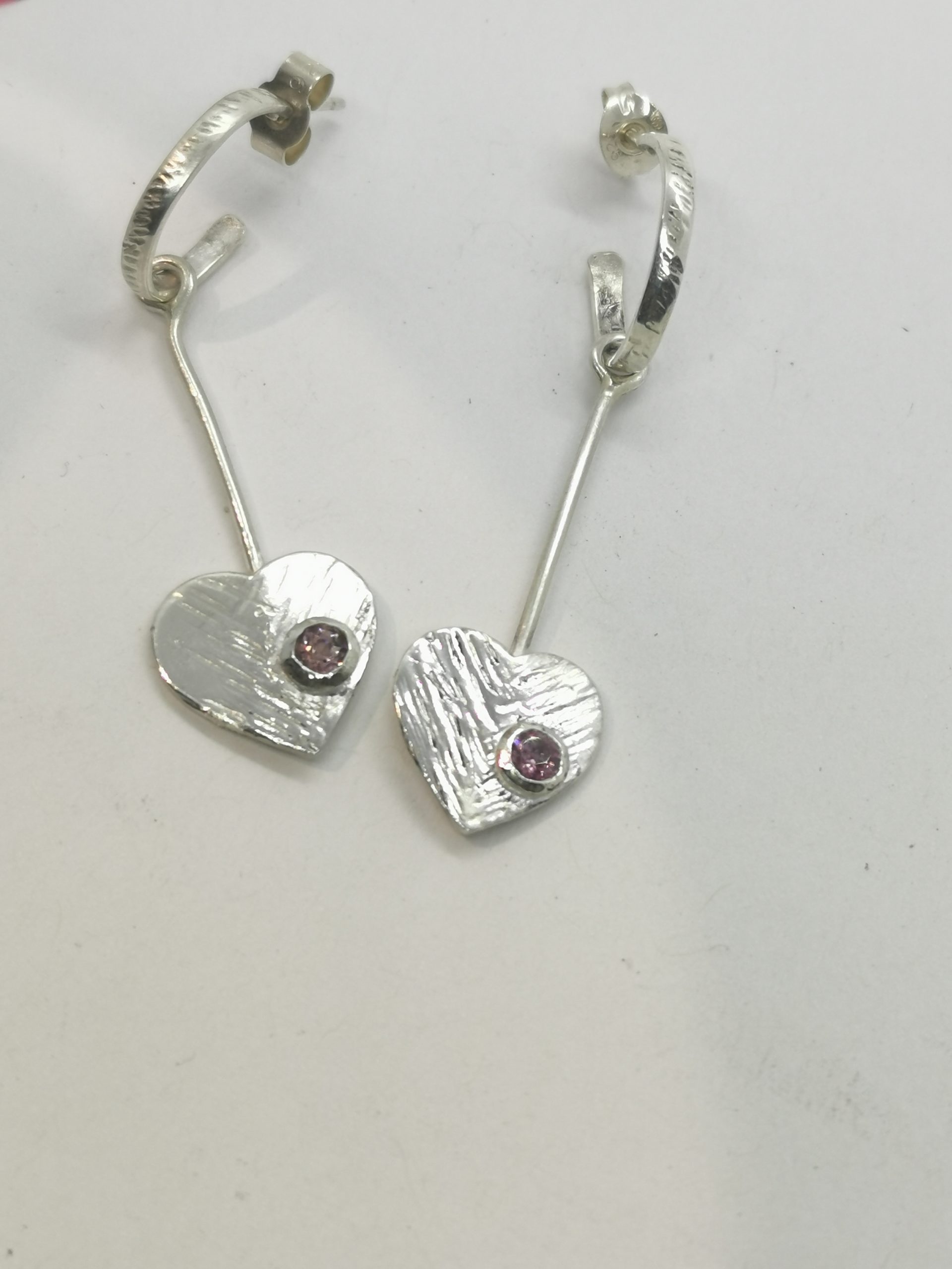 Les coeurs font environ 1 cm de haut. La longueur des boucles d’oreilles font environ 4 cm en tout. Topaze rose à facettes de 3 mm.