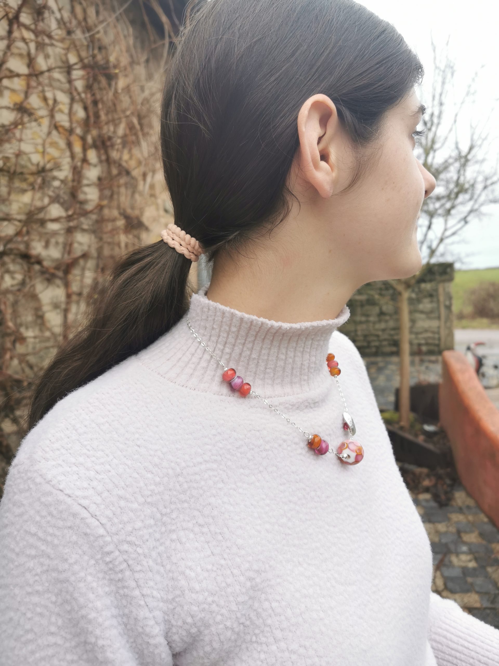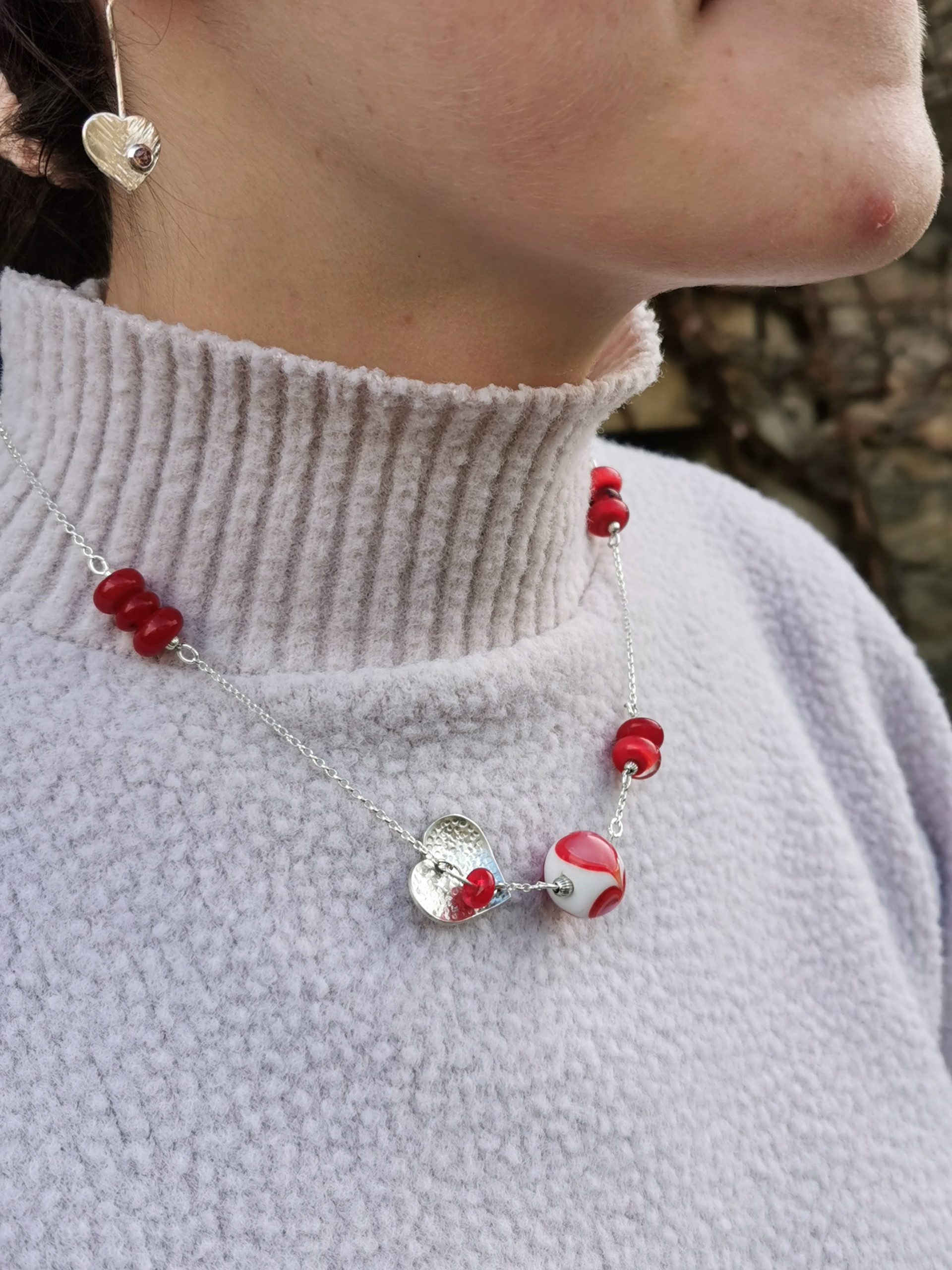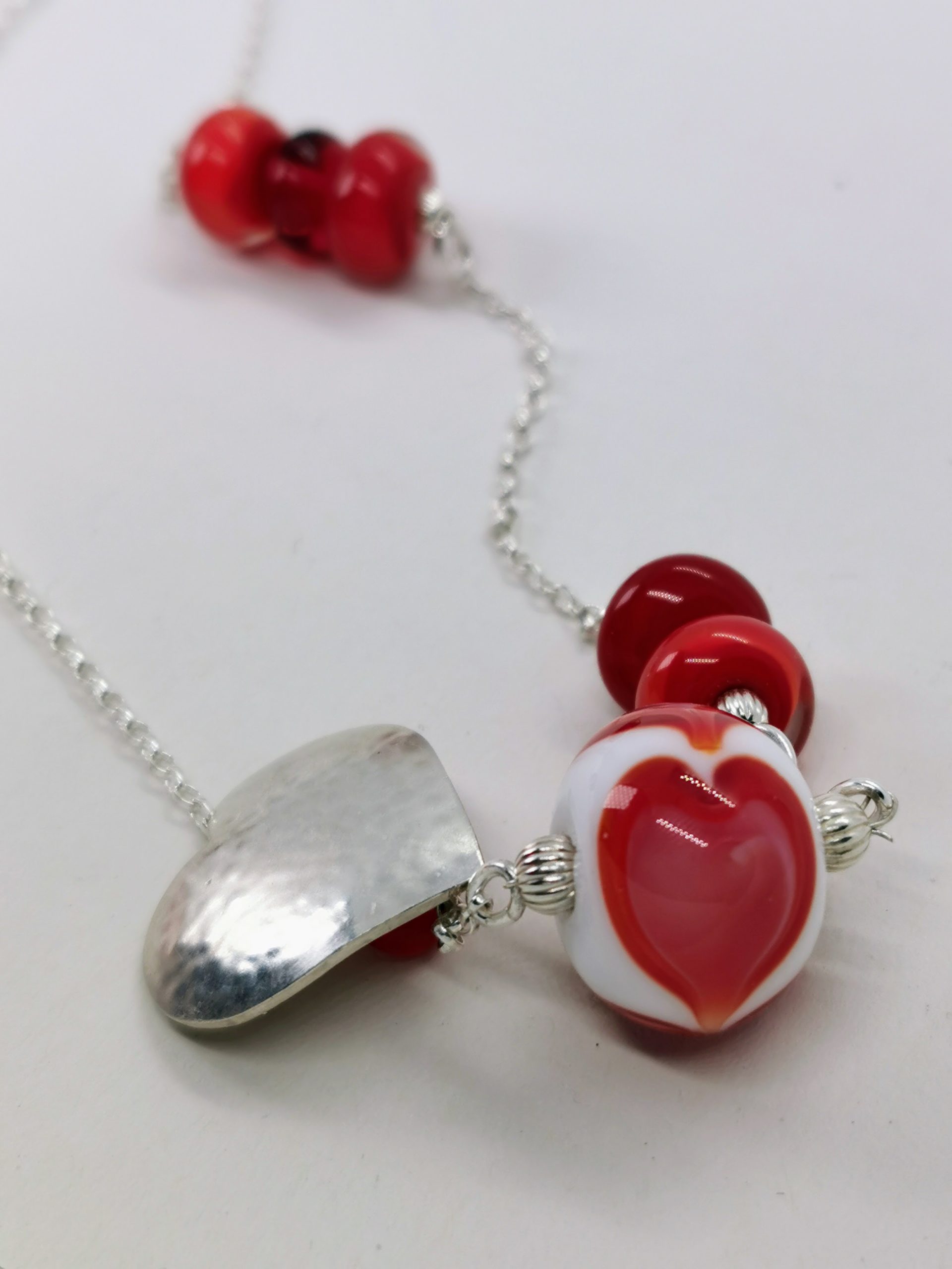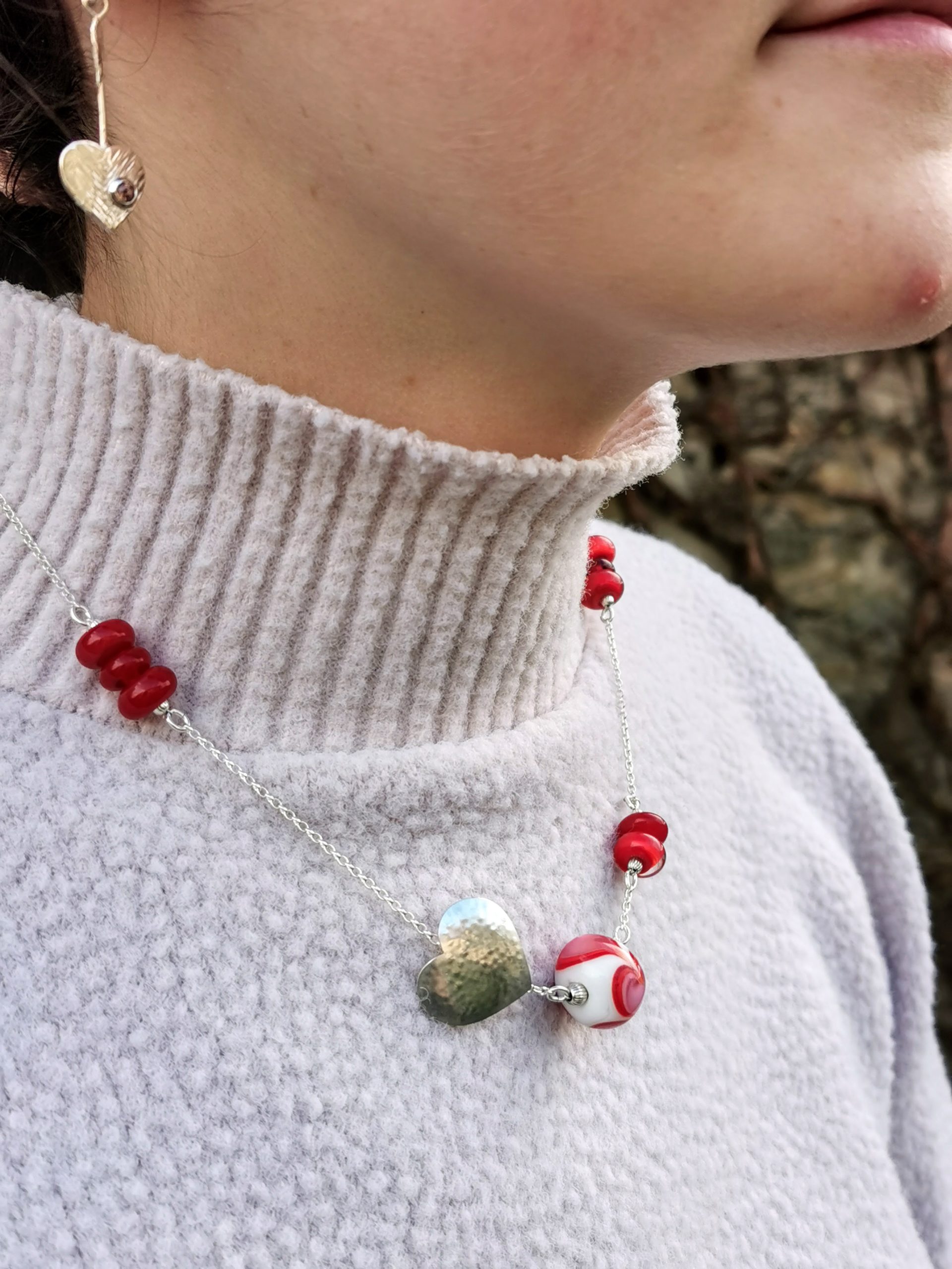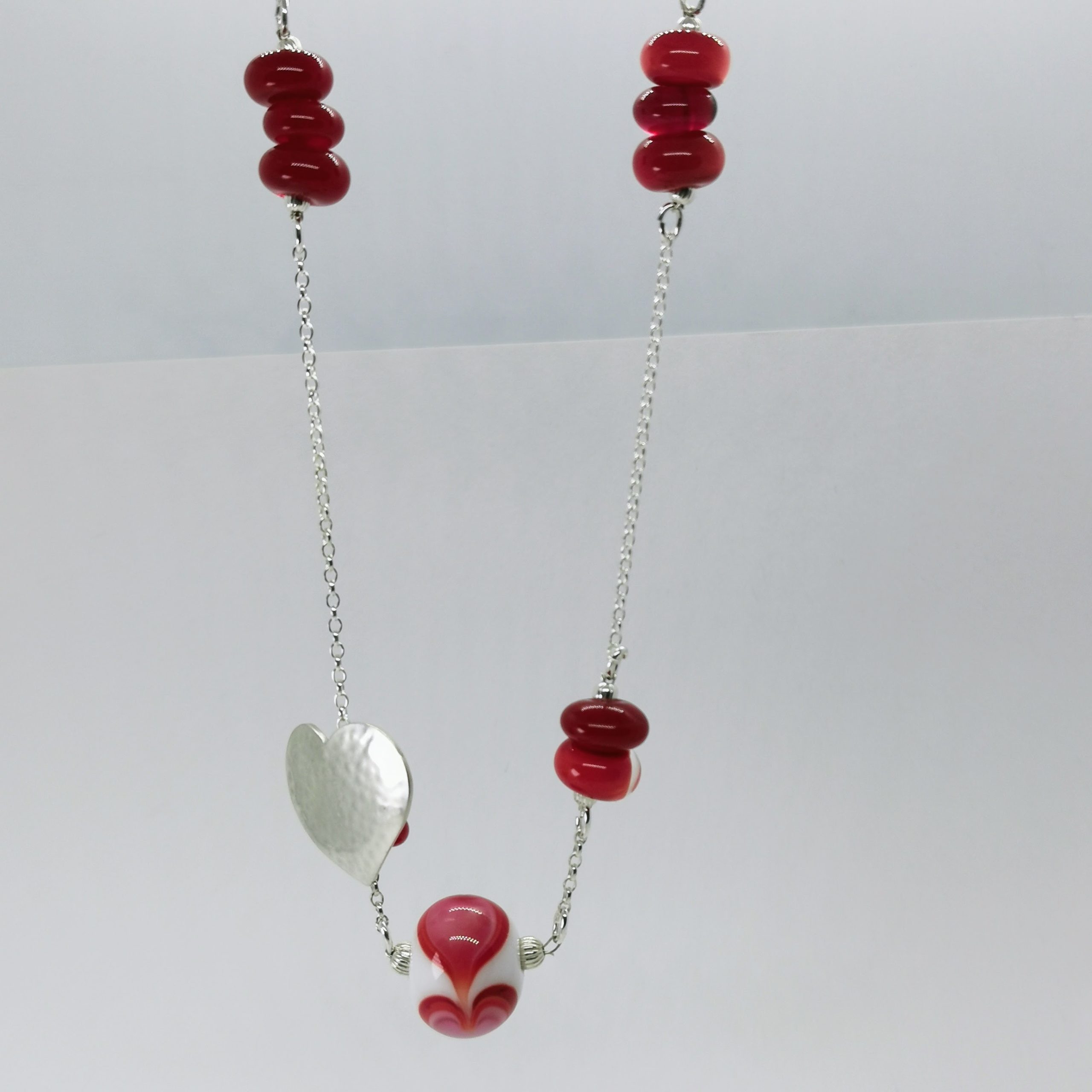 Perles de verre de murano dans les nuances de rouge avec un coeur en argent massif sur une chaine en argent massif.