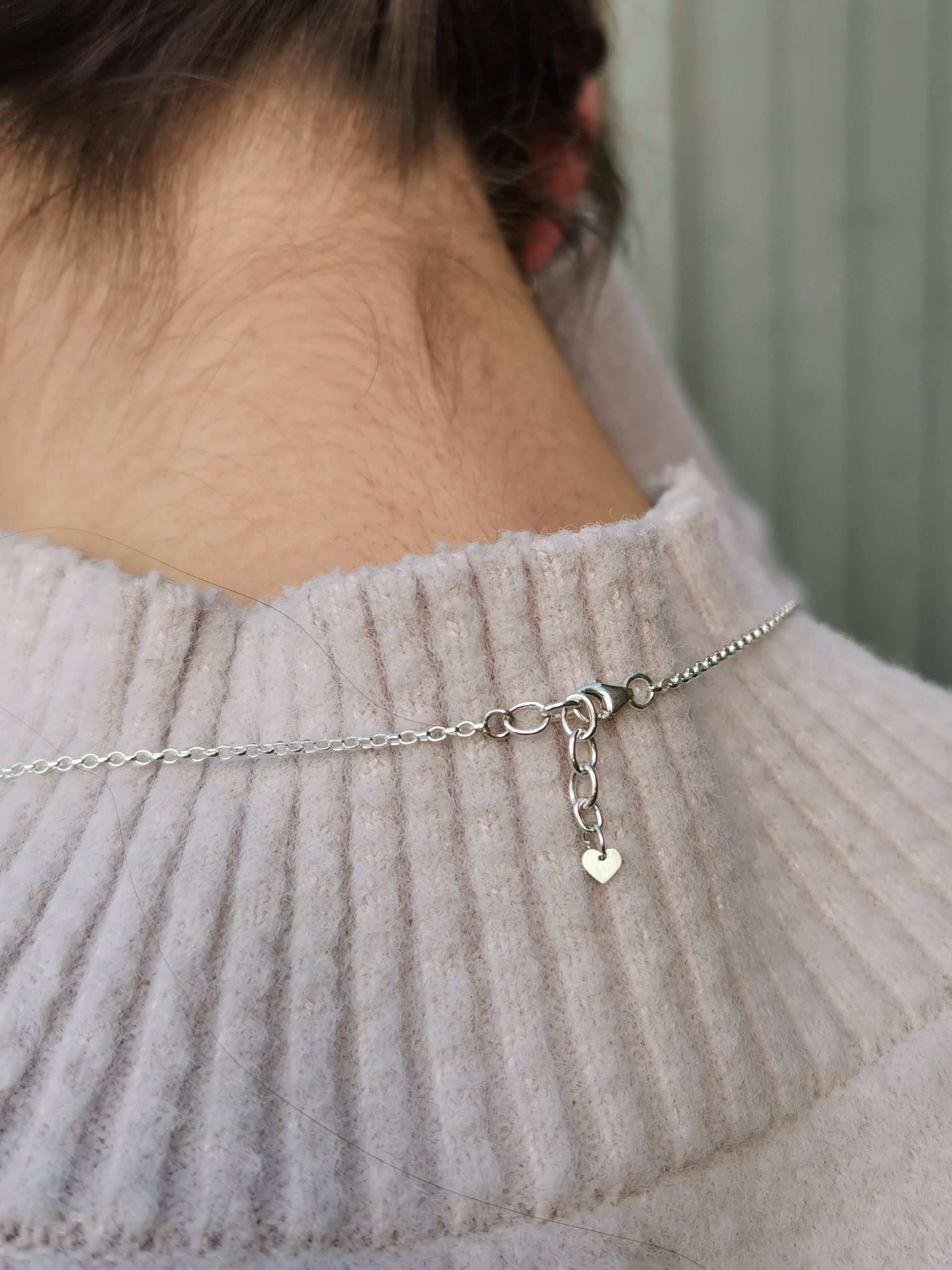 Le collier fait environ 45 cm de long avec une chaine d’extension de 4.5 cm pour porter ce collier plus ou moins long selon la tenue.