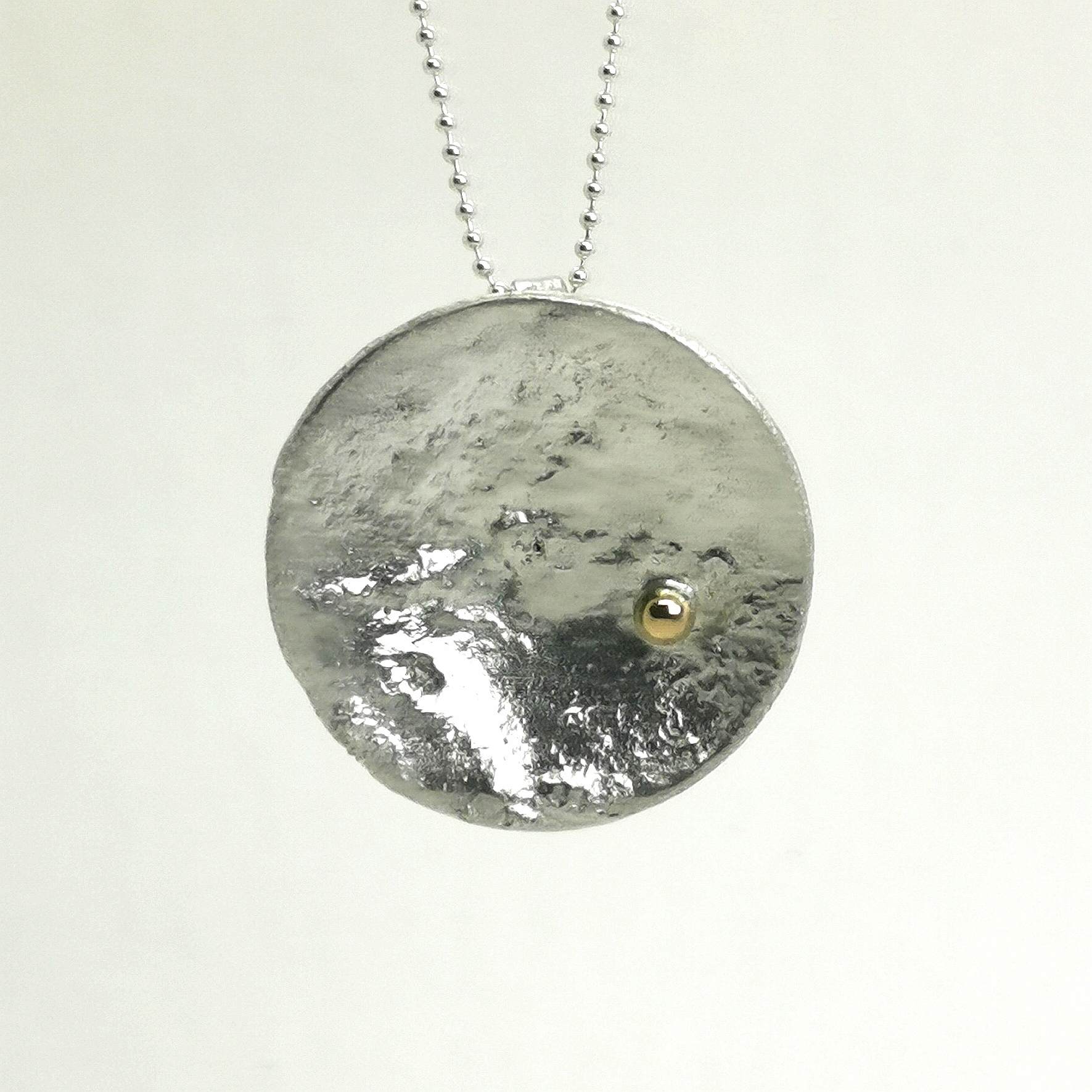 Magnifique pendentif en argent massif texturé avec une petite boule d’or 18c lisse.