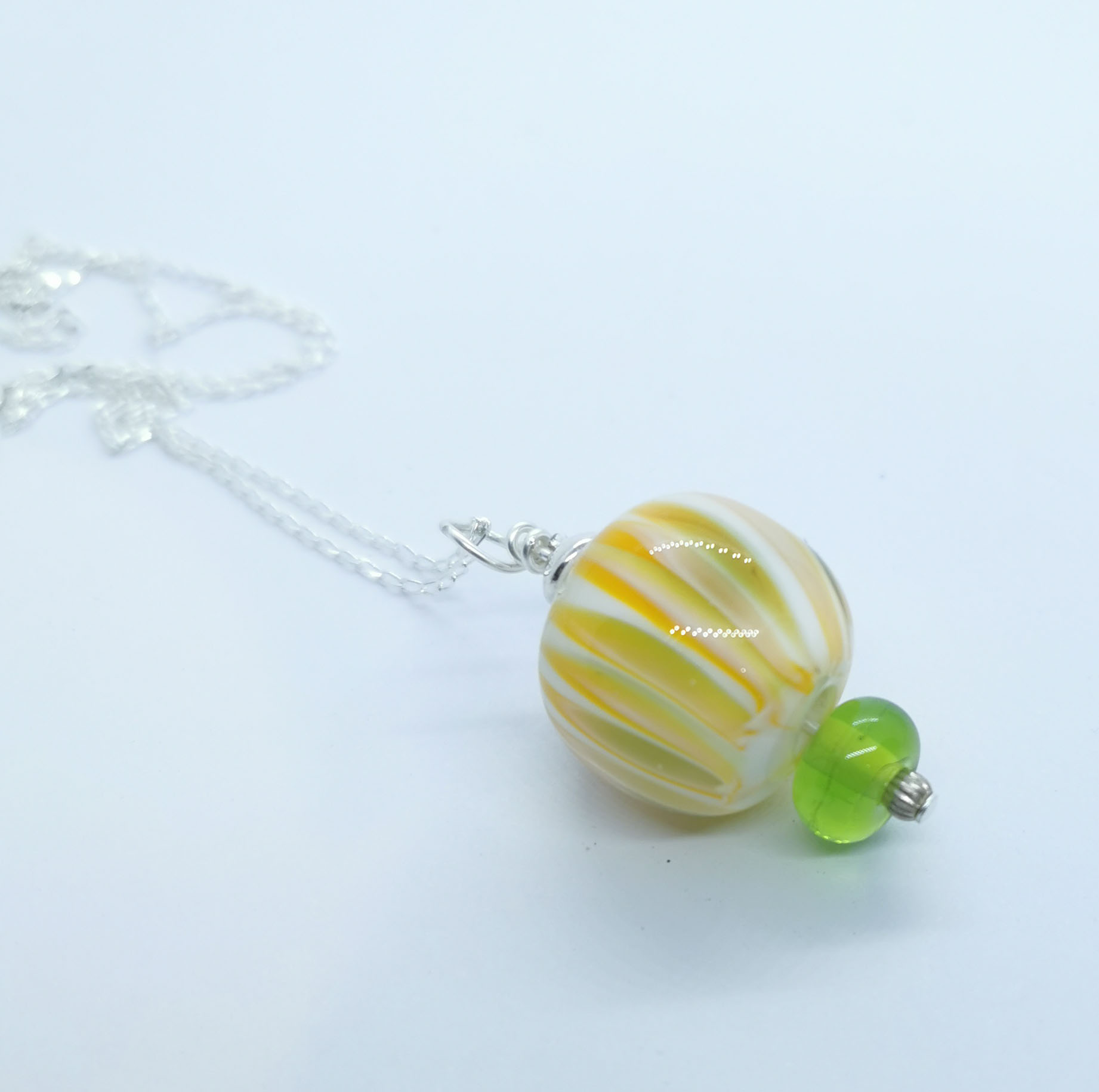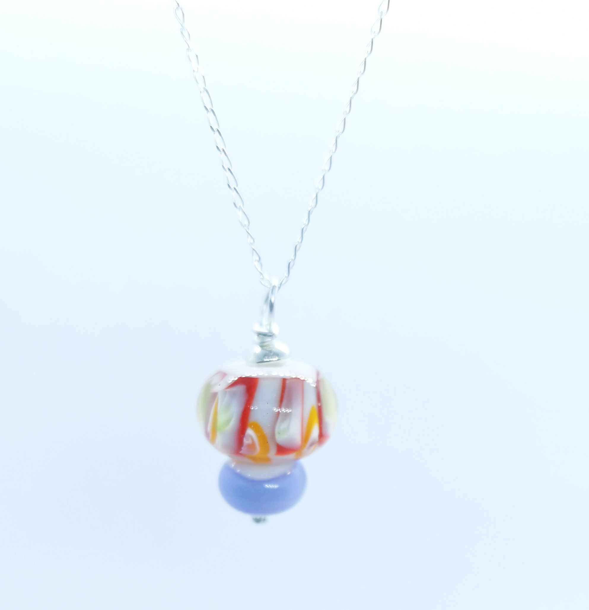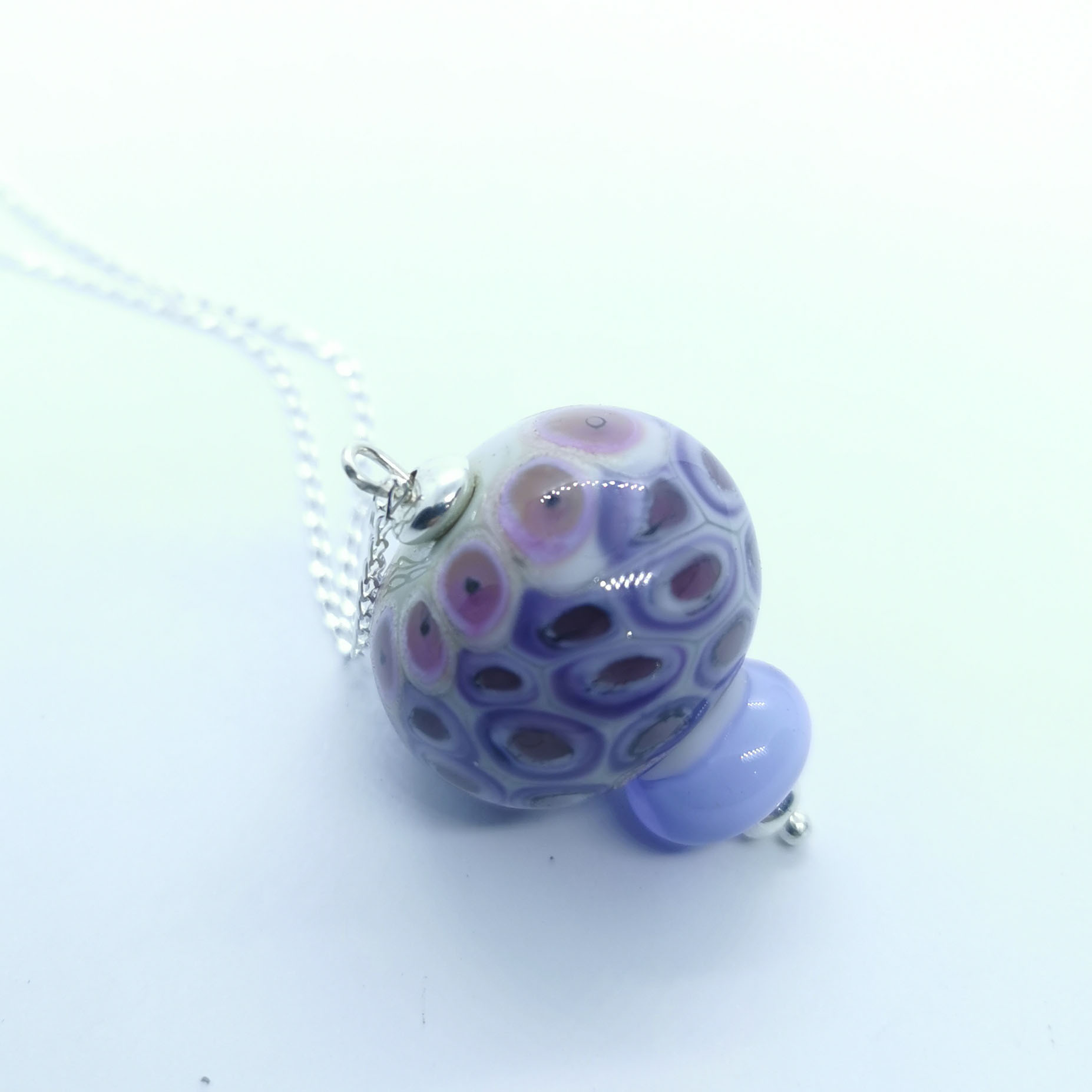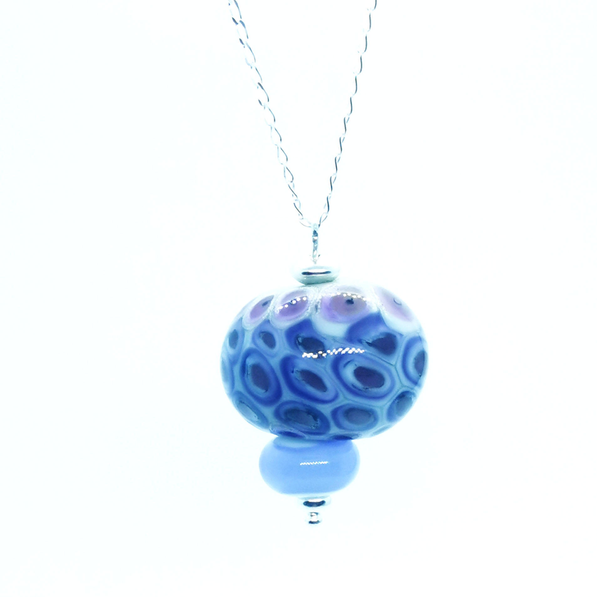 Pendentif d’une grosse perle en verre fabriquée dans mon atelier au chalumeau et d’une plus petite. Ces perles sont sur une tige argent avec des perles argent massif.
