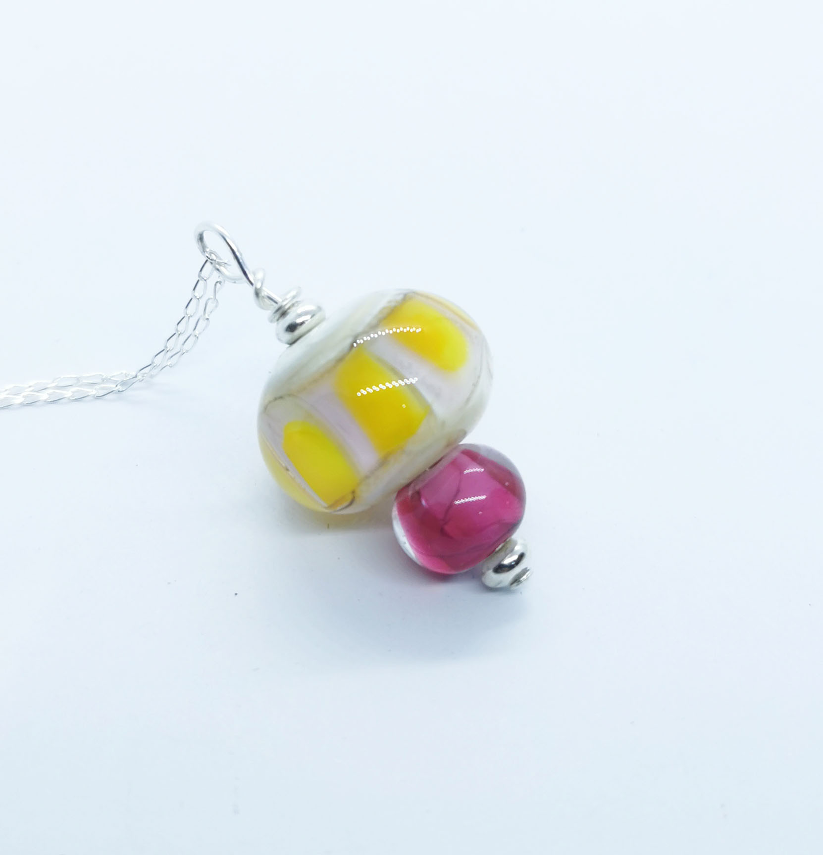 Ici la perle est blanche rayée jaune sur une petite perle rose fushia.