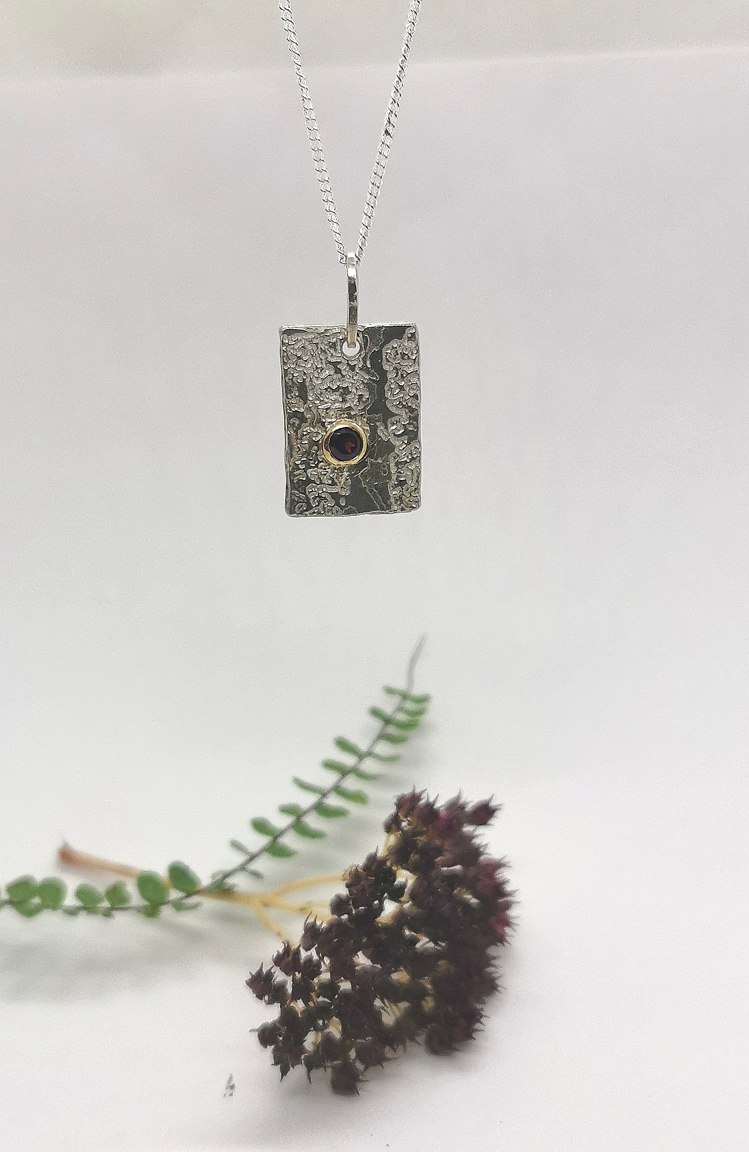 Pendentif rectangle en argent martelé avec grenat serti or – Homme