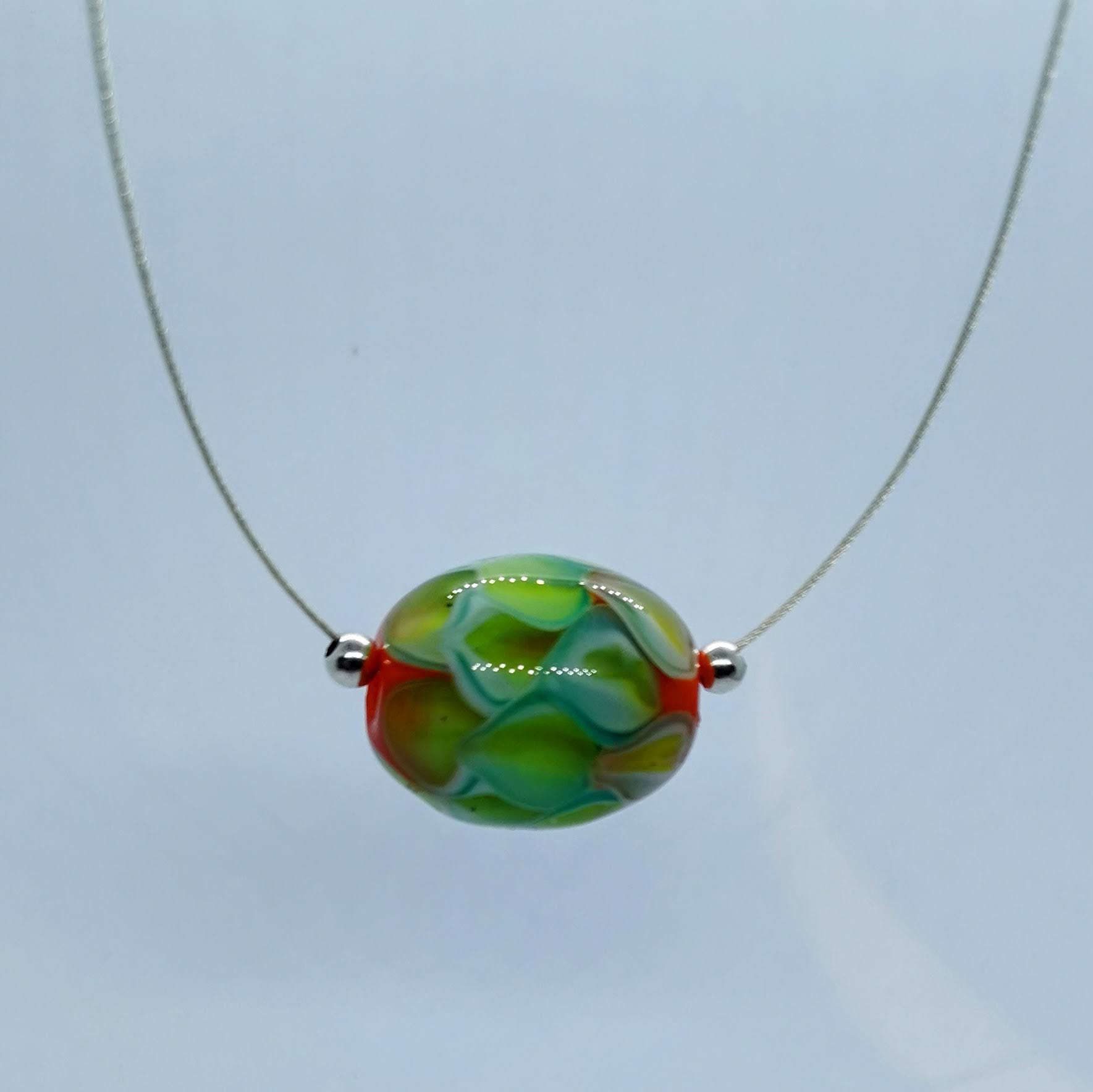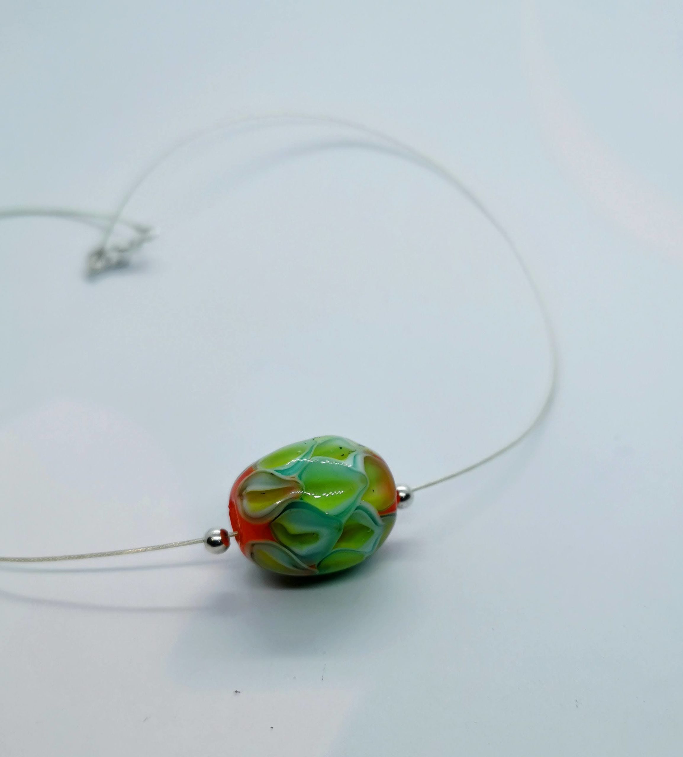 Ici une perle tricolore entourée de perles en argent massif le tout sur un câble argent massif.