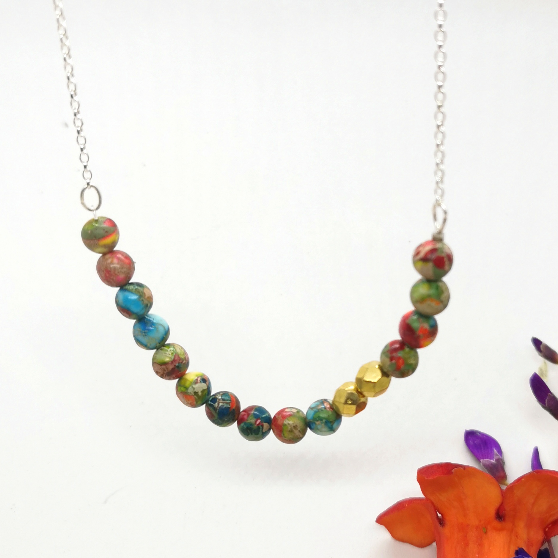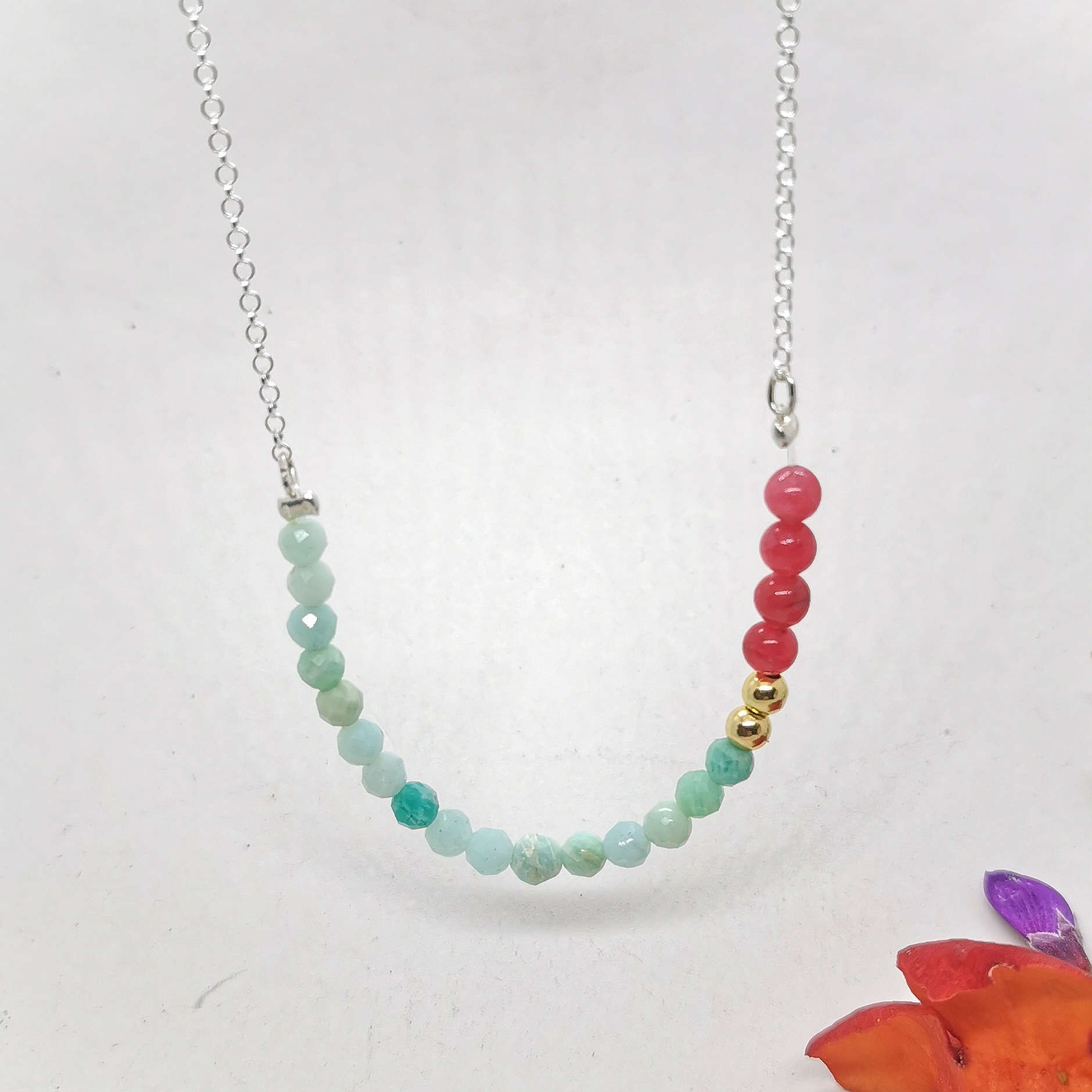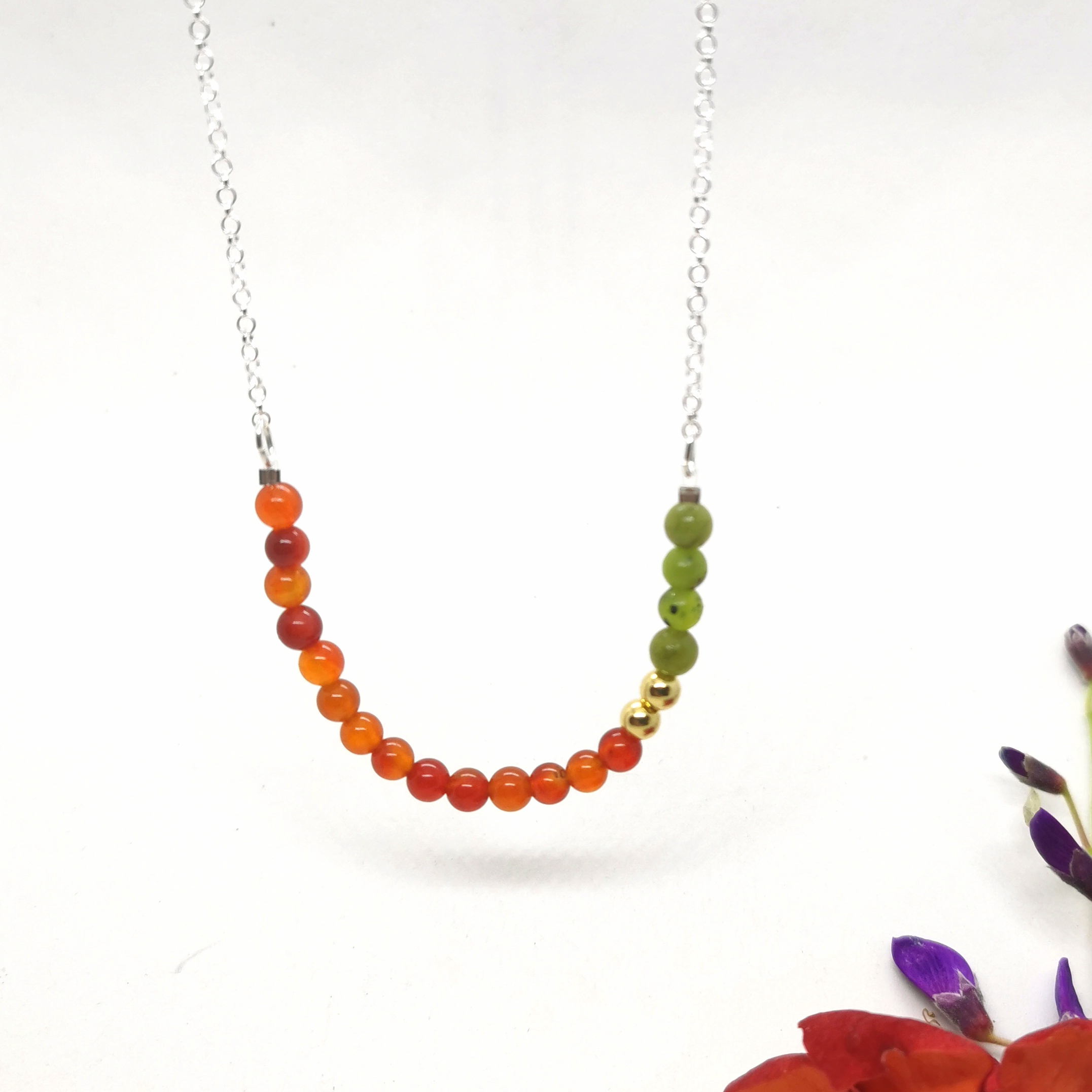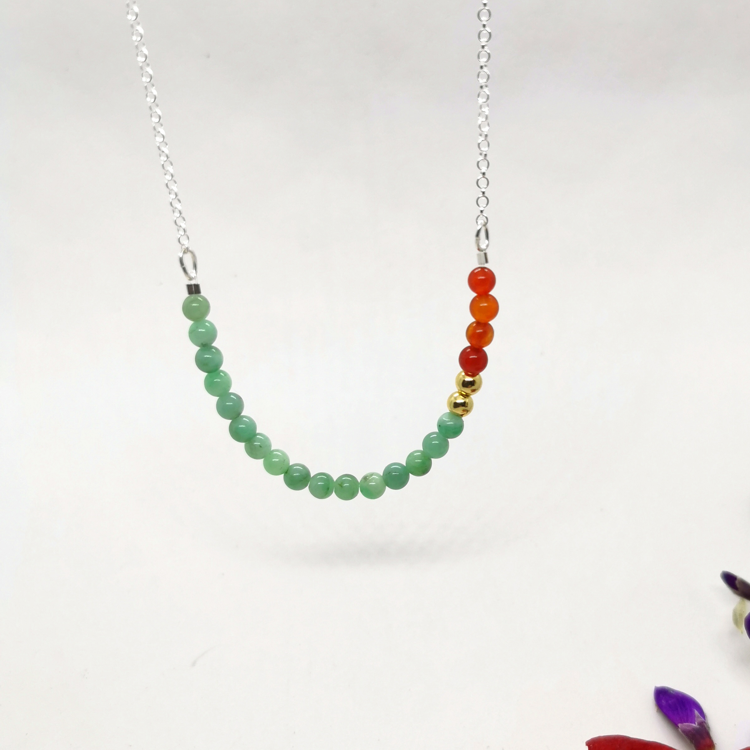 – Matériaux : pierres naturelles (ex. cornaline, émeraude), perles plaqué or, chaîne en argent 925